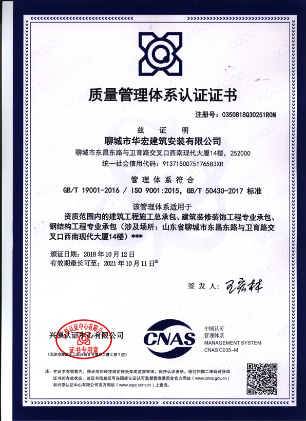 聊城市華宏建筑安裝有限公司成立于2002年5月,公司自2002年成立以來,不斷發(fā)揚(yáng) “敬業(yè)修身 打造精品 開拓創(chuàng)新 弄潮勇進(jìn)”的創(chuàng)業(yè)精神,始終遵循“以質(zhì)量求生存、靠精品創(chuàng)品牌、憑信譽(yù)贏市場”的宗旨,認(rèn)真奉行“科學(xué) 高效 一流”的質(zhì)量方針